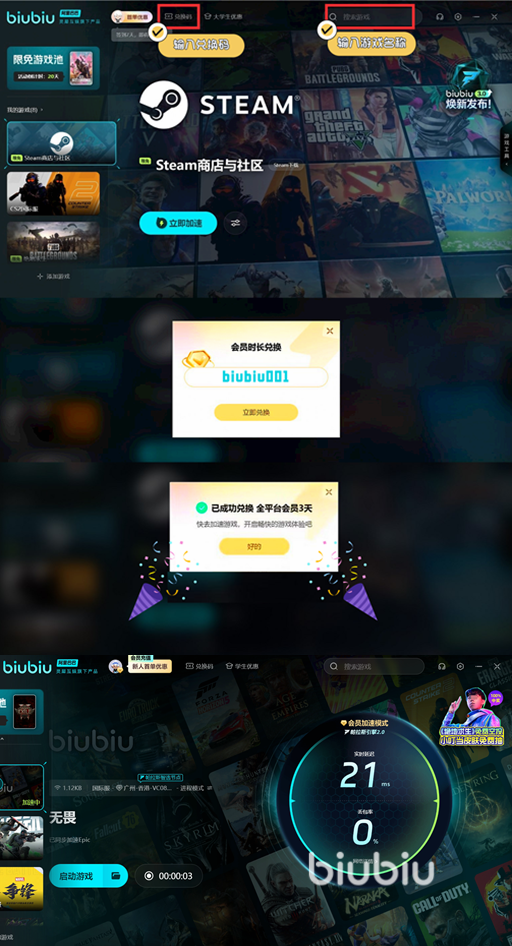 传奇武器的搭配总体来看还是比较简单,但使用它的时候也需要网络稳定才能完美发挥威力,因此推荐用biubiu加速器改善网络环境,它提供3小时免费加速给新注册用户,并且用兑换码【biubiu001】能额外再得72小时加速时长,等于一共免费加速75小时!