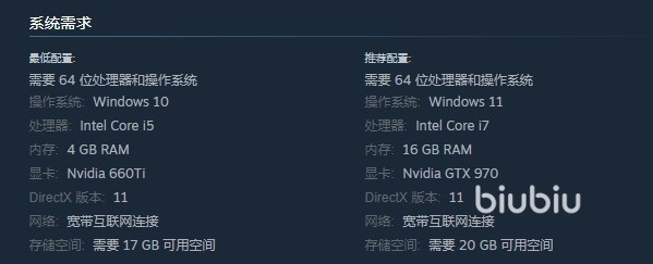 无畏所需配置如上图所示,系统需达到win10以上,cpu至少是i5,内存4G,显卡则保底需要660Ti,相比其他3D大作它的这些配置并不算高,并且内存占用也不大,提前留出20G以上的空间即可确保流畅启动该游戏。