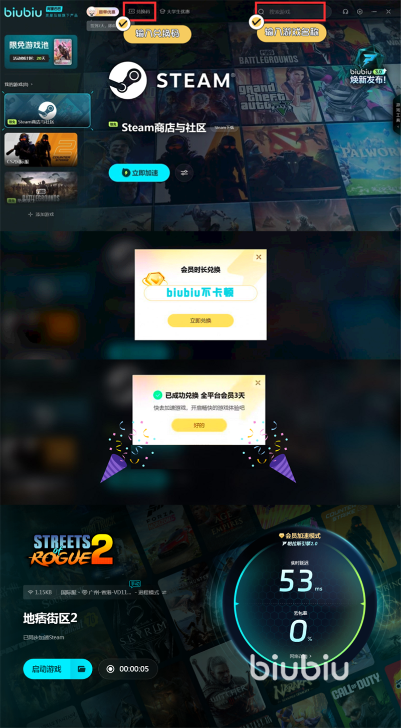 为了能够在联机过程中也获得优质网速,biubiu加速器功能是不可缺少的辅助项目,biubiu现在对新用户很友好,注册账号就能领三小时会员时间,先做到免费试用。不用担心时间不够的问题,后续还有一项每个号都能用一次的兑换码【biubiu不卡顿】,能直接换取长达72小时的会员时间,可谓诚意满满。这款作品在人工智能方面也达到了很先进的程度,玩家所作出的各种行为,都会对里面的虚拟人物产生喜欢或者厌恶,这些都会影响在虚拟世界中探索时所发生的各种事情。这里面所提供的道具也千奇百怪,例如香蕉皮、催眠器、缩小射线等,还有各种各样的枪械,这些道具直接关系在游戏中的任务和战斗。有些时候并不一定要正面硬刚,合理利用这些道具,可以不费吹灰之力地达到目的。