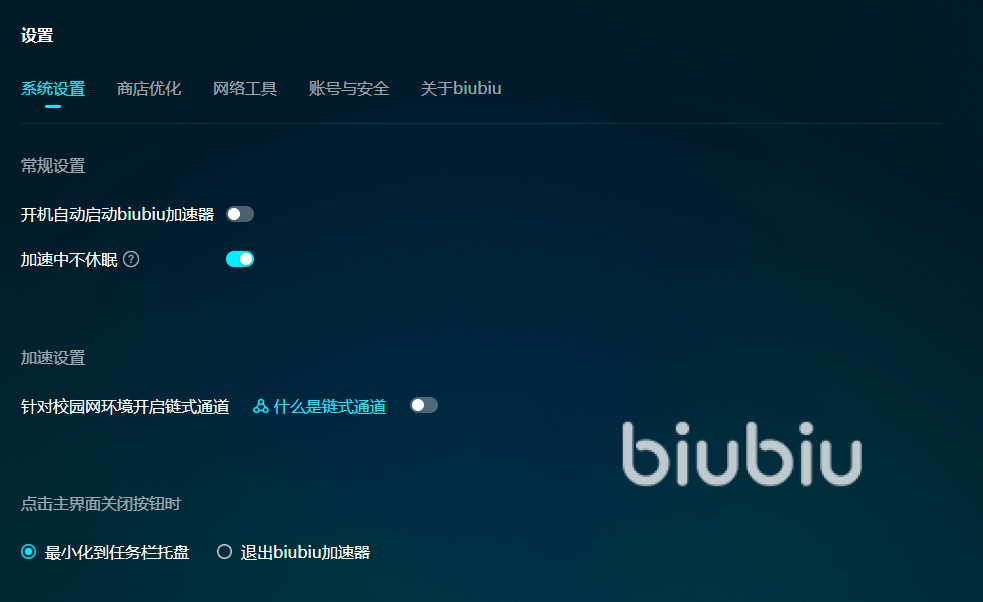 想要更快享受好网络,大家可以通过系统设置让电脑一开机就自动启动biubiu,还有链式通道、不休眠、关闭软件后自动最小化到任务栏这些个性化设置,用户都可以根据自己的习惯和喜好进行调整,设置完毕后软件用起来也更顺手了。