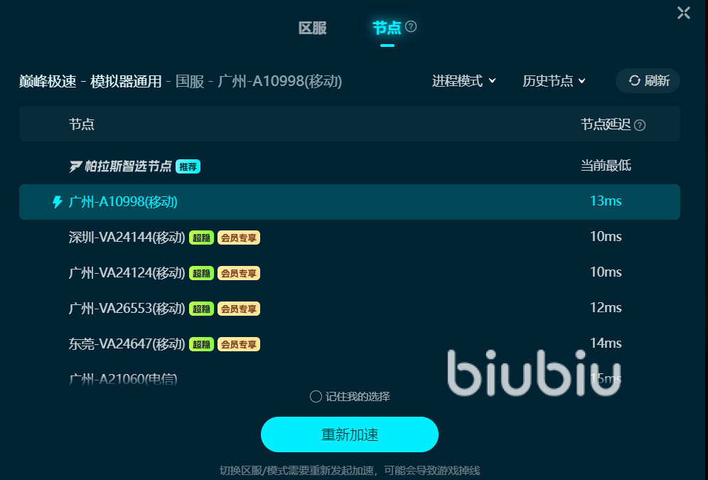值得一提的是Biubiu的操作非常简单,只需在软件内找到“巅峰极速”并点击一键打开,软件会自动为你优化连接,选择最佳节点并进入通道。即使在网络波动较大的情况下,它也能及时调整,确保游戏体验不会受到影响。
