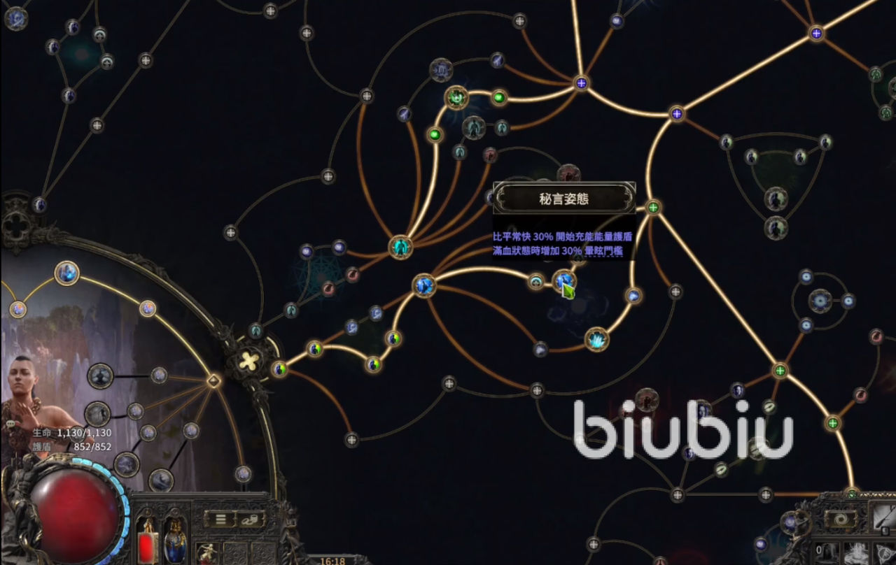 接着抓取另一个关键点秘言姿态天赋,比平常快30%开始充能能量护盾,满血的时候还能增加30%眩晕门槛。这一个关键天赋可以让充能护盾更快,把这条路线的几个都点上的话,就能实现很短时间内就开始回补。