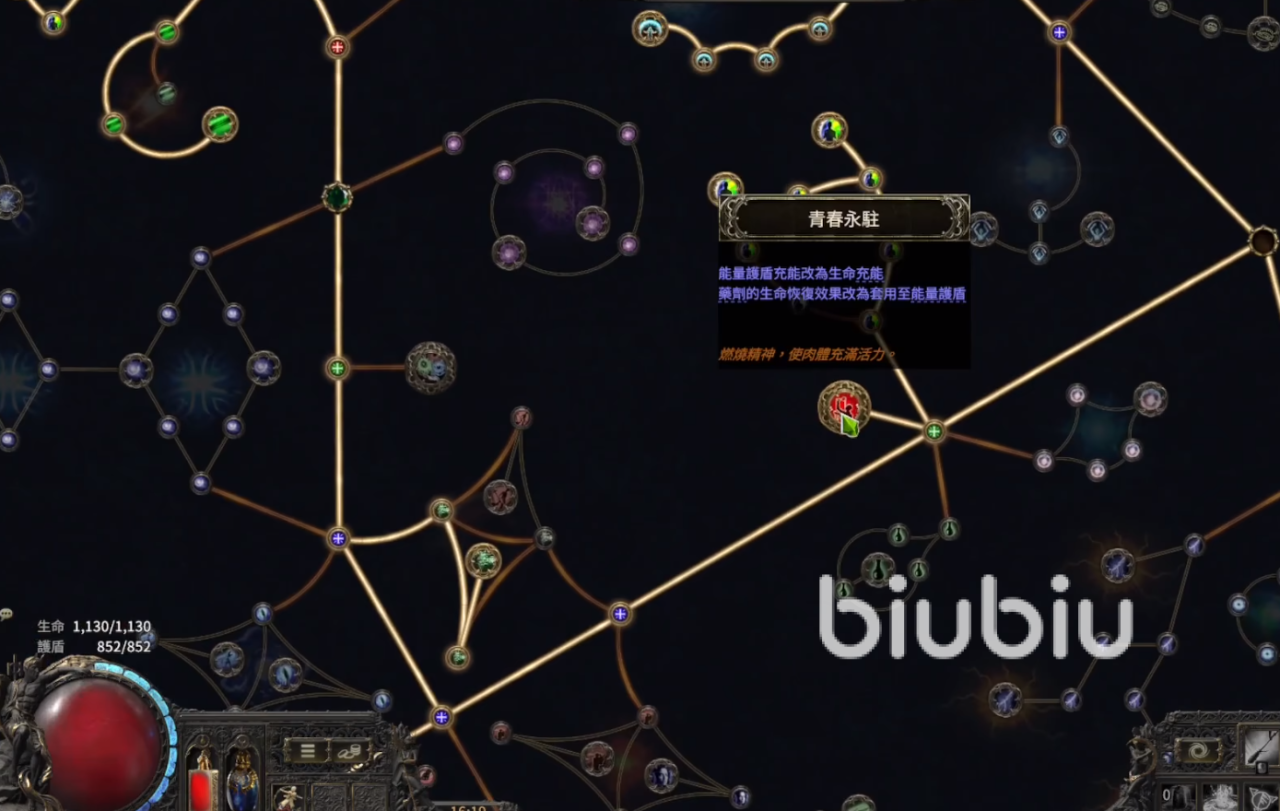 那么接下来,点生存路线上的青春永驻,这一条线都可以直接直线点。因为前期可能玩家的药水不充足,如果有青春永驻的效果,那么你可以将护盾转化为生命值,稍后就能迅速恢复血量。大后期就可以把青春永驻洗掉,将天赋换成以护盾为主的那一条线。