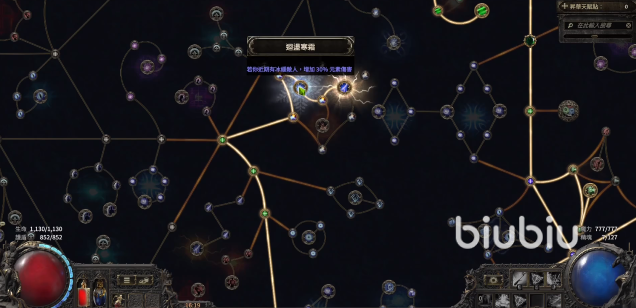 那么往上一条选路,点击那一个带有闪电纹路的天赋迴盪寒霜+迴盪雷电,效果是近期有感电敌人,那么增加30%元素伤害,冰缓敌人的时候可以获得30%的元素伤害。可以通过物理转元素伤害去打,这两个是玩法体系必须带的。