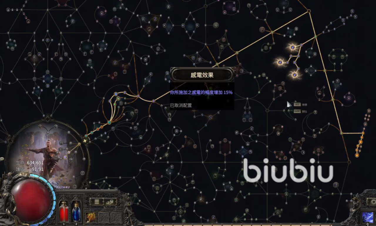 然后继续往上点,直到拐角处点击三个带有闪电花纹的圈,建议三个大圈都点上,三个的效果分别是:无限循环有25%的几率,消耗敌人身上一层感电来重新施加该技能。狂野风暴则是提升15%的最大闪电伤害。暴露于风暴,主要是增加18%雷电抗性以及伤害穿透,对待有闪电暴晒敌人的暴击伤害增加30%。