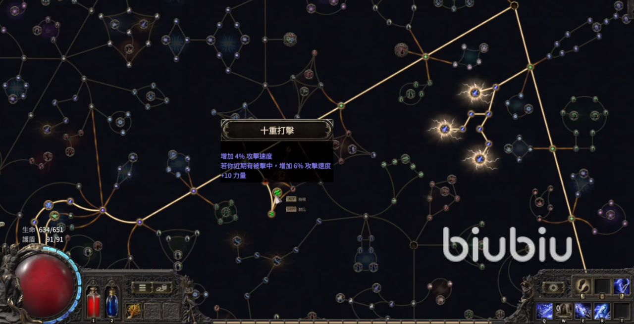 接下来沿着这条路径往上走,经过十重打击这一条天赋,建议点上。十重打击的效果是增加4%的攻击速度,如果玩家在战斗中有被击中过的话,还能够增加6%的攻击速度以及10点力量。