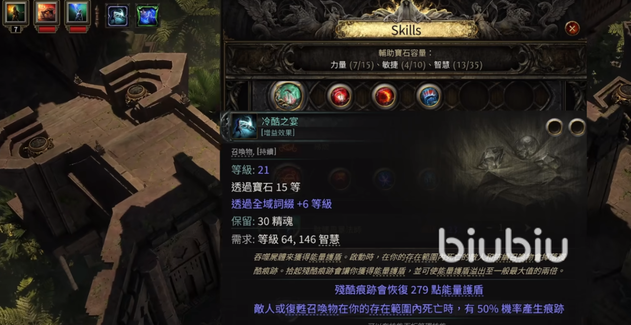 然后最后再加一个护盾的冷酷之宴,这是可以在持续召唤物的时候捡起能量护盾,这里不需要加额外辅助石。