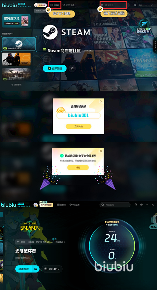 biubiu加速器可以稳定降低延迟,改善丢包卡顿问题,同时支持新用户免费加速3小时,如果使用【biubiu001】这一兑换码还能解锁额外72小时的加速时长,相当于一共最多能获得75小时的免费加速!