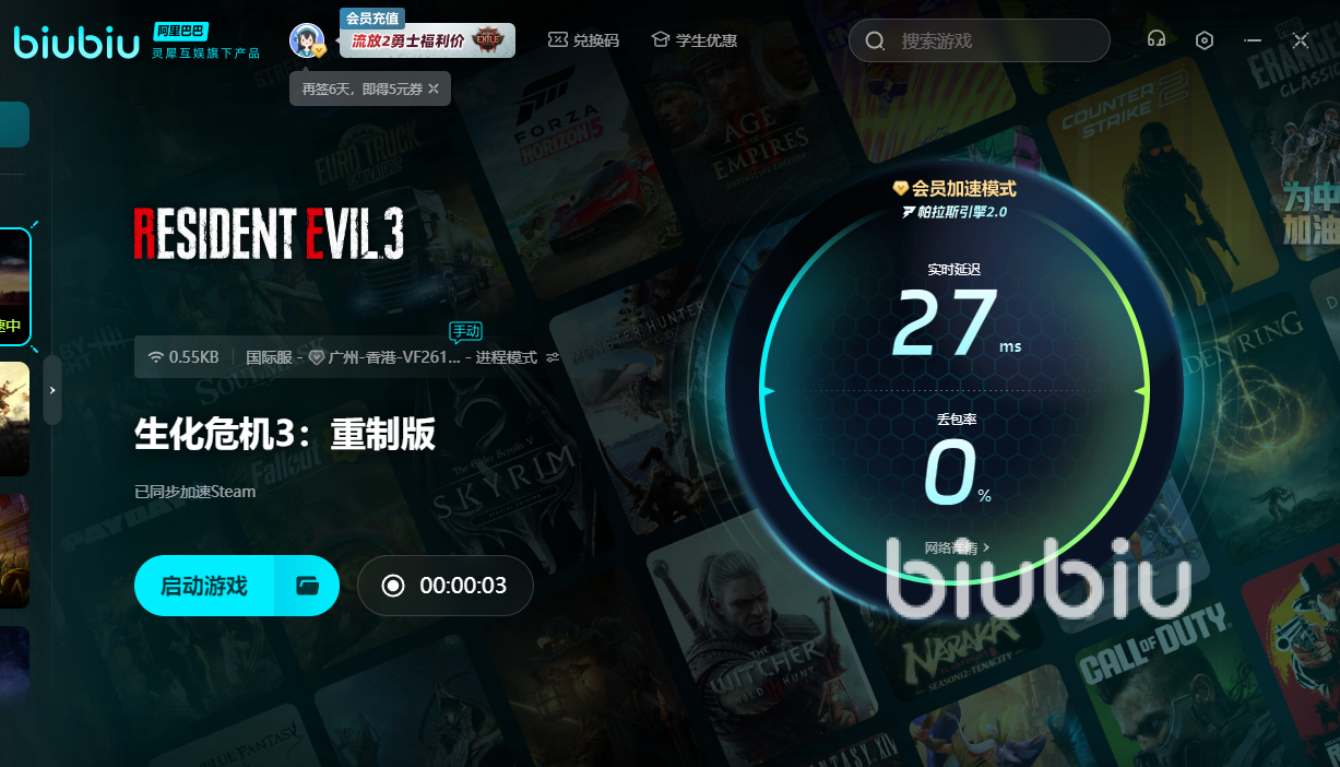 生化危机3重制版目前来说暂时没有国服上线,为了进入这一片异域之都。我们就要开启biubiu,才能够被直升飞机送到这里来解决丧尸。新用户的话,可领取三个小时的免费加速。此外新老玩家输入【biubiu不卡顿】,就能额外领取三天免费加速。如果在刚开始时就卡顿,可能连丧尸群都突破不出去。采用加速器后,才可以一鼓作气地闯过前面的难关,而不是被这些僵尸围堵在后面。