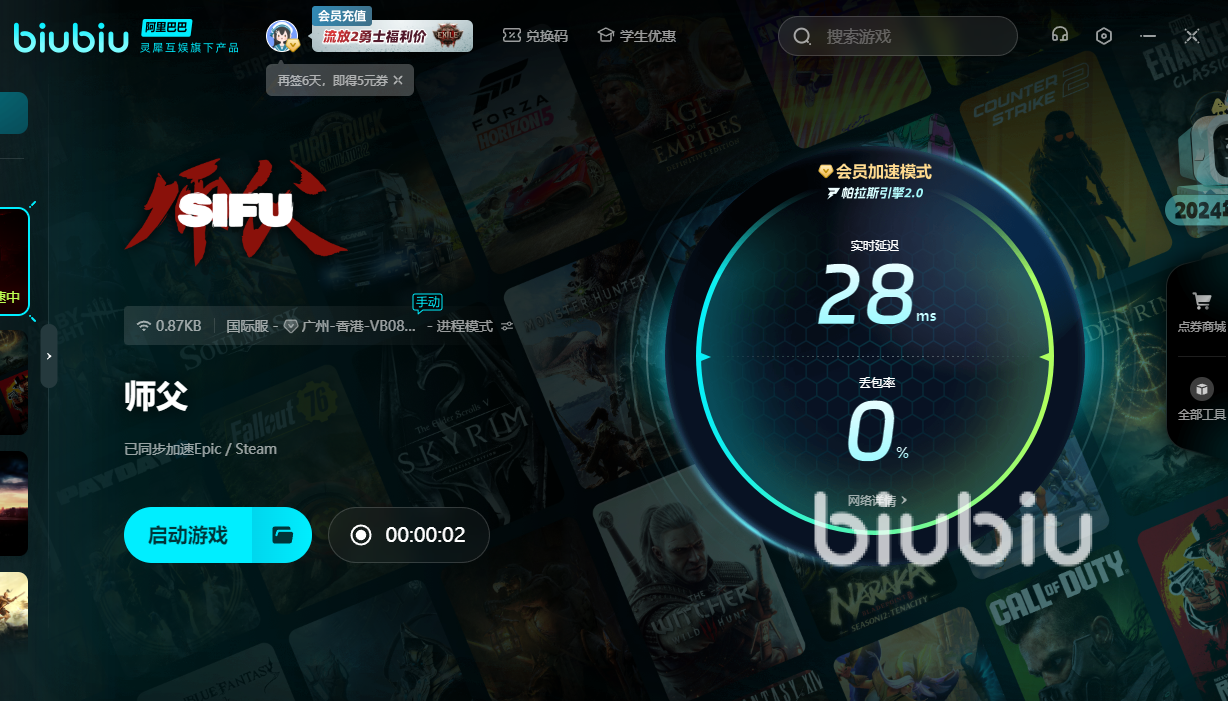 师父如今仍旧是款海外大作,所以暂时没有上线国服。如果你想成为一个享誉全球的功夫大师,就要用上biubiu,才有能力继续ko一路上的对手。新用户的话,可领取3小时的免费加速。此外新老用户输入【biubiu不卡顿】,就能额外获得三天免费加速。如果在拼的过程中太卡,就会被路过的一些小卡拉米消灭。所以就可以用上加速器,还能让你再复仇之路中不会卡到半途就腰折。