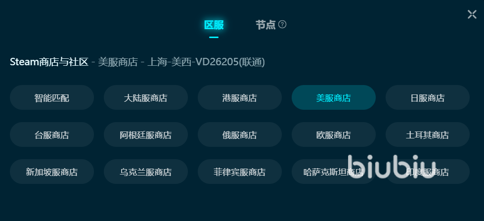 其次要注意Steam平台上有一部分游戏是锁国区的,国内玩家无法直接搜索到这些游戏。为了跨越这一障碍,很多玩家可能在网络上寻找复杂的教程,如清除下载缓存或重新注册外服账号等。其实使用biubiu切换到国外的节点就可以做到了。