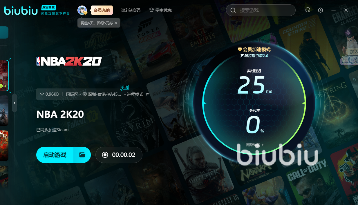 NBA2k20作为家喻户晓的海外大作,如今仍旧没有上线国服。所以为了与其他人一同展开比赛,又得用上biubiu,加速后才能与他们一较高下。新人的话可领取3小时的免费加速,此外新老用户通过【biubiu不卡顿】,就能额外获得三天免费加速。如果打篮球途中太卡的话,那自己的球就会容易丢落在其他地方。所以必须用上加速器才能更好的运好手中的篮球,将它传递给下一个队友。