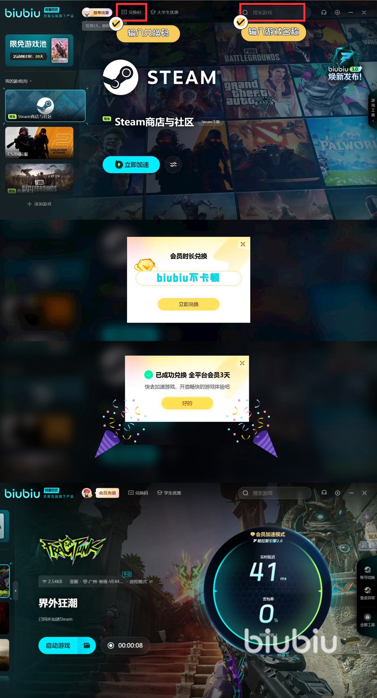 虽然是国产作品,但是测试阶段很多玩家仍然遇到了网络延迟卡顿的情况,和玩家本身网络有一定关系,其实更多的还是没有打开加速工具的原因。上面给大家推荐的加速器下载后,新用户注册就可以获得三小时的免费加速时长,后续还能通过输入【biubiu不卡顿】额外获得72小时,长达三天体验能够让大家在游戏上线后体会到第一波和好友开黑roll点的快感;延迟问题其实也和众多的卡牌元素有关,比如让整个屏幕长满草以及多个玩家闯入视野和技能特效等等的加载,很吃电脑配置和网络。