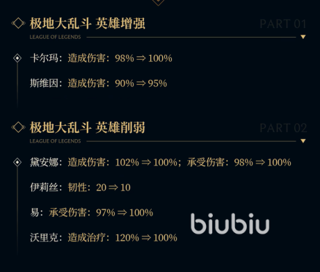 极地大乱斗玩法也是有了调整,卡尔玛以及斯维因是迎来了增强,伤害百分比得到了提升,戴安娜伤害以及承伤效果都被削弱了,伊莉丝韧性从20下调到了10,沃里克的治疗量也是从120%下降到了100%。