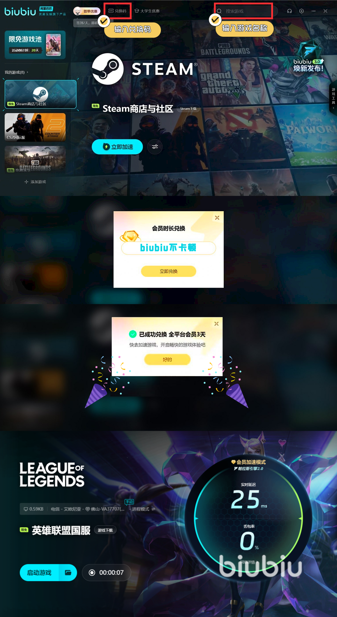 参与对战玩法,其实我们最需要的就是稳定网络,不然这么快的节奏,稍不小心就掉线了,再爬上来也不容易跟上节奏哦。那就跟着小编一起来biubiu优化网络吧。现在新人可以免费用3小时的,然后用【biubiu不卡顿】给新老用户换72小时提速时间之后,新人可以用到75小时了。