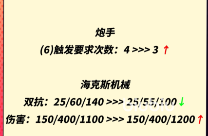云顶这次可是有大改动啊,首先就是降低了我们开局奇遇的持续时间,这样玩家可以更快的进入战斗状态了。然后3阶段是会提供不同的基础装备的。羁绊也有改动,炮手触发要求次数从4调整到了3,而海克斯机械的双抗是降低了,但是伤害有加成的。