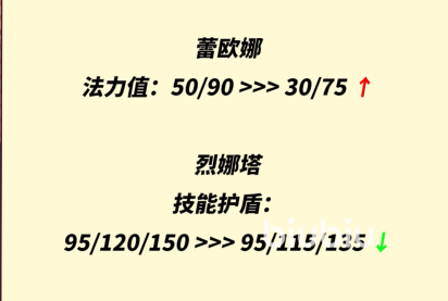 弈子也有改动的,蕾欧娜的法力值从50/90改动到30/75,然后列娜塔的技能护盾效果是降低了一些了。