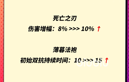 装备变动也比较大,像是死亡之刃,它的伤害增幅是从8%提升到了10%,薄暮法袍则是双抗持续时间从10变成了15。