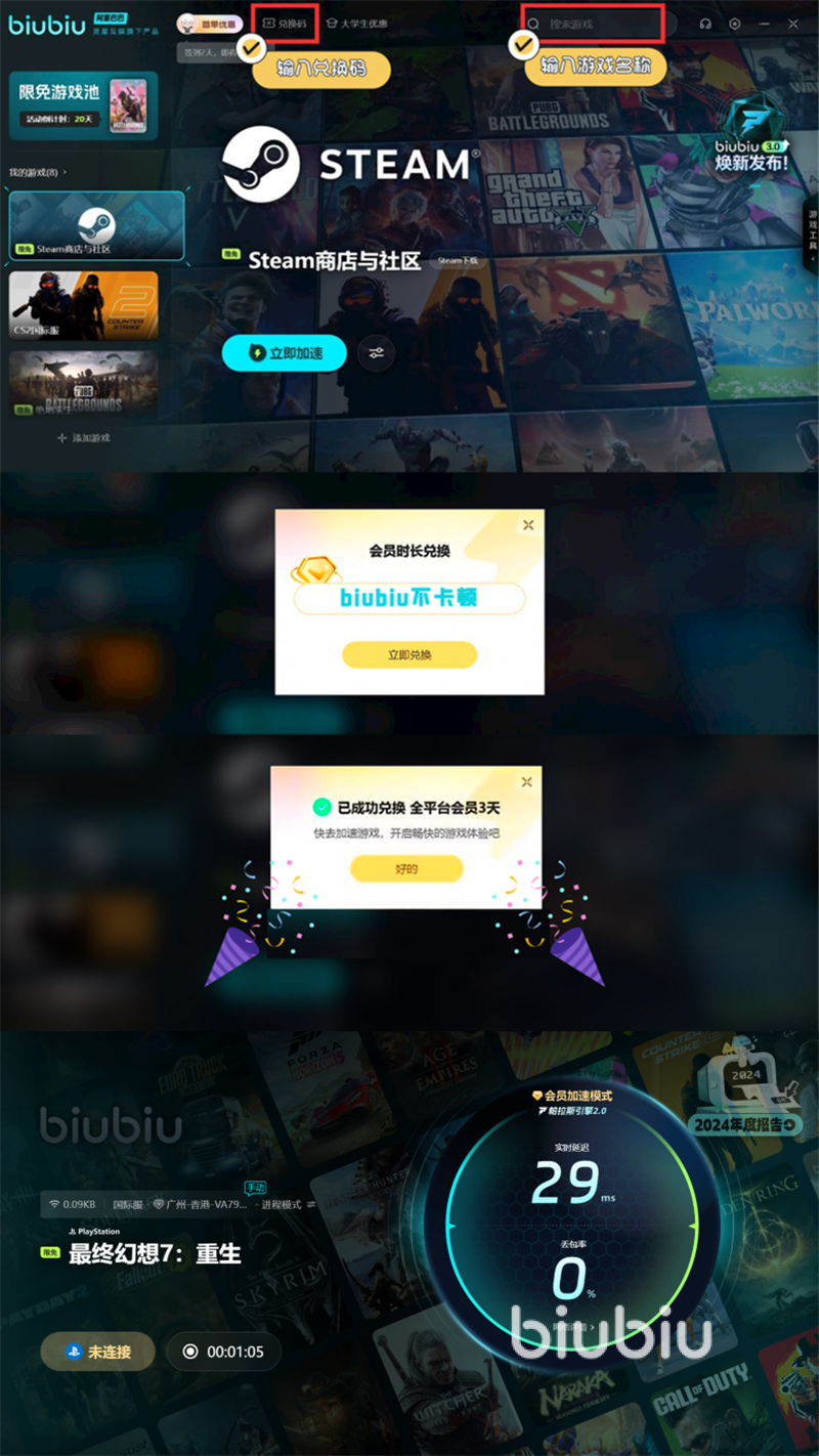 今天小编的推荐给大家一款非常好用的加速器工具biubiu,可以通过biubiu直接搜索游戏名称,然后点击进行优化,直接打开客户端就行了。Biubiu现在推出了兑换码福利,兑换码是【biubiu不卡顿】,每个号都能用一次,兑换三天会员时间。如果是刚刚注册的新账号,那么还能额外领取三小时会员时间,用完之后再用兑换码。在战斗过程中用蒂法近身直接攻击,完美格挡对方的攻击,找机会使用爆裂拳,打几拳之后奥丁就会释放战马厮鸣,尽量完美格挡。当奥丁释放战马厮鸣后闪避拉开身位,使用勇气加强攻击力,继续上面的打法,将其打到力竭,力竭状态后蒂法打三发暴力拳就可以释放极限技了。然后克劳德释放无尽终结,爱丽丝放两发技能就能成功带走。
