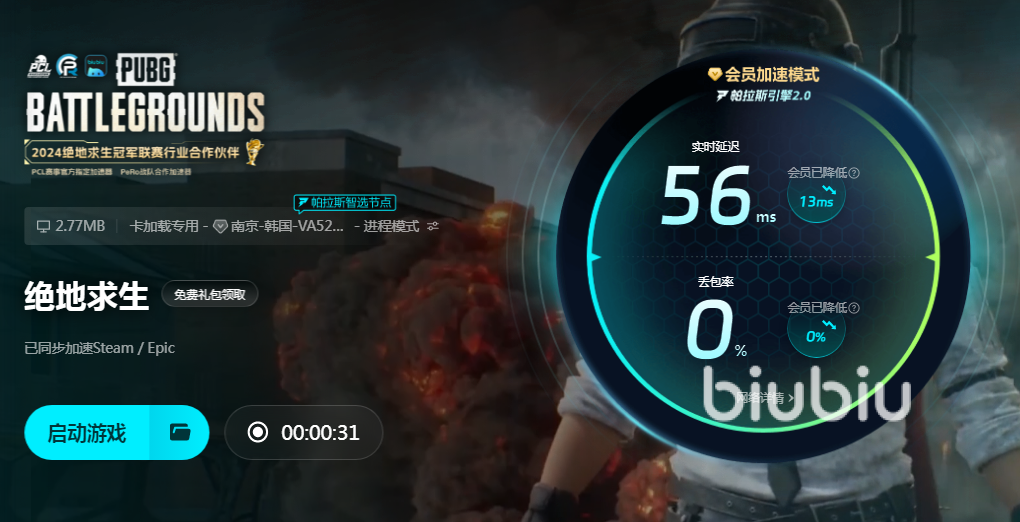 biubiu支持加速端游绝地求生和主机绝地求生,大家现在输入【biubiu不卡顿】也可以得到3天免费加速时长。系统通过智能节点加速,用户不需要自己选择线路,它采用专线加速,不怕被限流,反而还能大幅度提升网速,用户享受到的网速堪比电竞级别。很多玩家一直向往电竞选手,这回在biubiu的帮助下大家总算也能体验电竞赛事般的网速了。