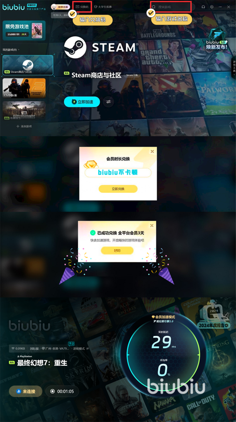 如果大家感觉做任务或者是战斗的时候不太流畅,那就使用biubiu来优化吧,现在注册新账号能直接得三小时会员时间,新人很适合加入进来。还有一项通用福利,每个账号都能领取一次,用兑换码【biubiu不卡顿】去兑换三天会员时间。大家在找牛的途中会经历一些战斗,但最后的结果是出现了一头神秘龙捷足先登,接下来要做的就是将这头龙打败,然后割下肉回去当做诱饵。来到之前接任务所在的位置,把获取到的肉放到桌子上,这时秃鹫过来后,让摄影师拍照片就能完成任务了。要注意这项任务影响的是蒂法的好感度,所以对后续的约会也有一定的影响。
