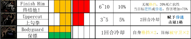 还有很强力的终结他技能,是无视格挡,以及20%的死亡抗性的,打出来6~10点的伤害,如果目标是在茫然以及昏迷状态,就可以获得75%的伤害加成。上勾拳是可以让目标昏迷的,可以跟上一个技能搭配使用。防护方面,也有保镖技能,可以让自己的格挡*2。