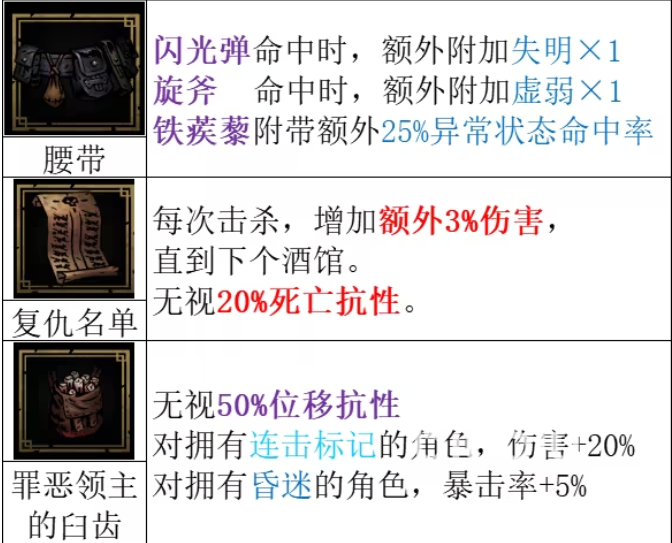 该英雄是有一些适配性很高的饰品的,腰带可以提升闪光弹,旋斧以及铁蒺藜的技能效果,复仇名单则是在击杀的时候,为自己额外增加3%的伤害,而且还有无视20%死亡抗性的效果。而罪恶领主的臼齿,用上就可以无视50%的位移抗性,如果目标有连击标记,还可以增加20%伤害,要是目标昏迷了,暴击率还能增加5%。这些搭配上了,就是纯粹的输出,面对boss的时候用,效果是更好的。