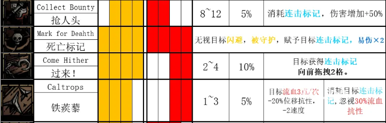 他的技能很多,效果也不错,抢人头是可以消耗连击标记,增加50%的伤害的。死亡标记则是可以无视闪避,自己被守护,然后赋予目标连击标记。过来这个技能是一个控制技能,可以给目标施加连击标记,并且把目标向前拖拽2格。铁蒺藜是可以使目标流血3点的,而且减少20%的位移抗性以及2点的速度。