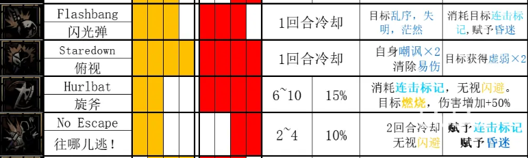闪光弹技能可以让敌人乱序,失明以及茫然的,消除目标的连击效果,还可以让敌人进入昏迷状态。俯视技能是帮助自己清除易伤状态的,但是自身嘲讽会*2。旋斧是可以消除连击标记,无视闪避让敌人进入燃烧状态,伤害还能增加50%。往哪逃则是让目标进入昏迷状态,并给它加上连击标记。