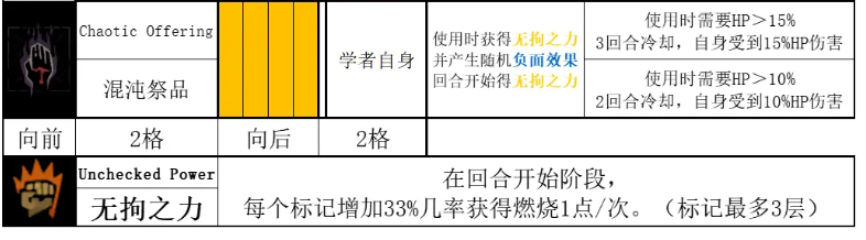 混沌祭品是对学者自身使用的,可以获得无拘之力,但是自身会得到一个负面效果,使用也是有要求的,自身的hp>15%。但是无拘之力是可以让标记对象,有33%概率获得燃烧状态的,1点伤害一次。