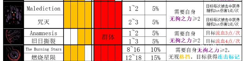 状态技能还有很多,虚弱诅咒可以让敌方虚弱,然后弱点术式则是可以让敌人更加容易受到伤害,还无视闪避,咒灭则是可以让敌人每次被击中都得到一个随机的伤害,旧日撕裂则是可以让目标进入流血状态,还是群体攻击。燃烧陨星技能基础伤害值就非常强。