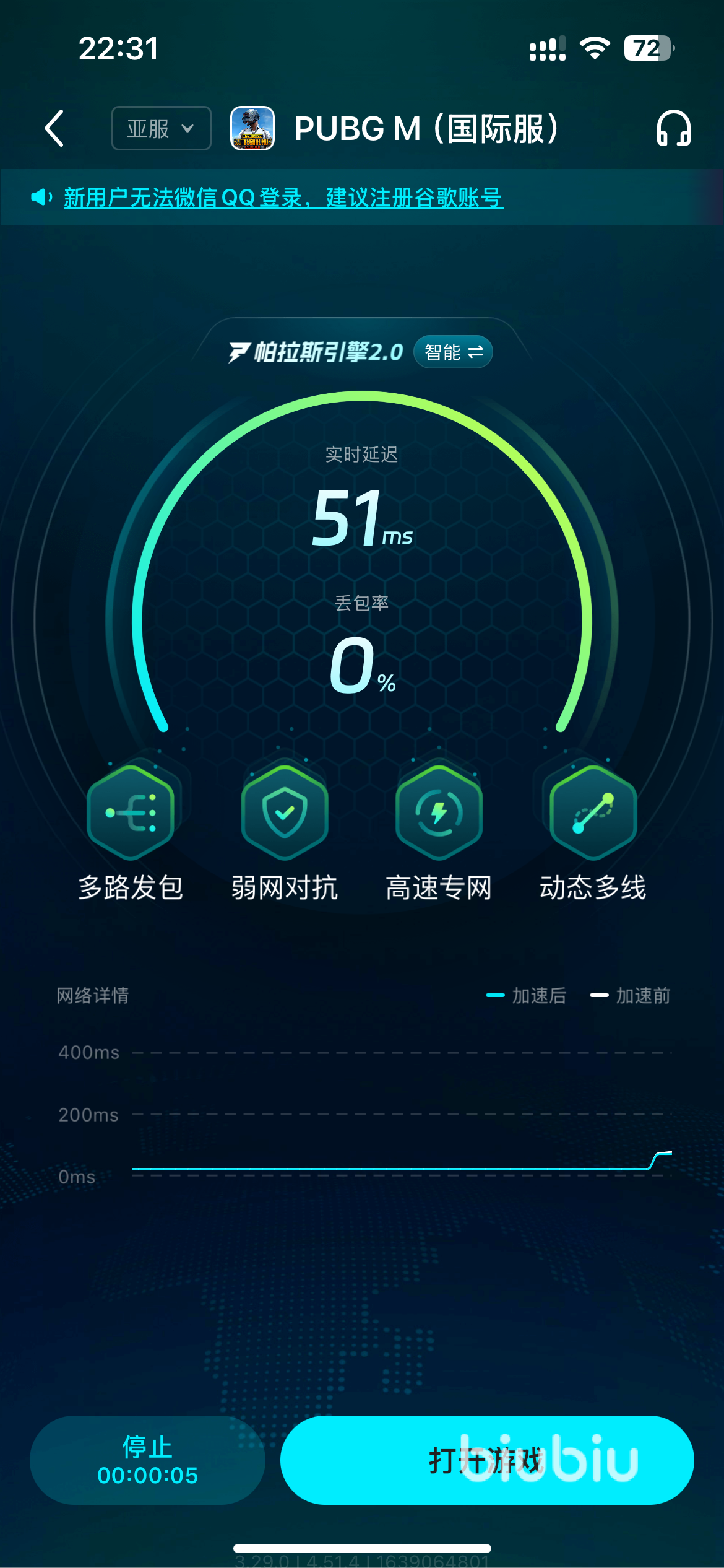 在游戏中,投掷物扔的足够好也是非常关键的,需要大家学会利用燃烧瓶封敌人走位,还要学会空爆雷、手掐雷等操作,而如果网络延迟太高的话,很容易出现手雷捏在手里自爆,把自己炸倒的尴尬情况,在组排的时候很容易给队友造成压力,而biubiu可以根据大家当前的网络状况给大家推荐最优的节点,连上以后丢包率也会大大降低,扔雷也能扔的更准,而且新用户注册就可以免费享受三小时的加速时间,还能通过看视频领取额外的加速时间,福利满满!
