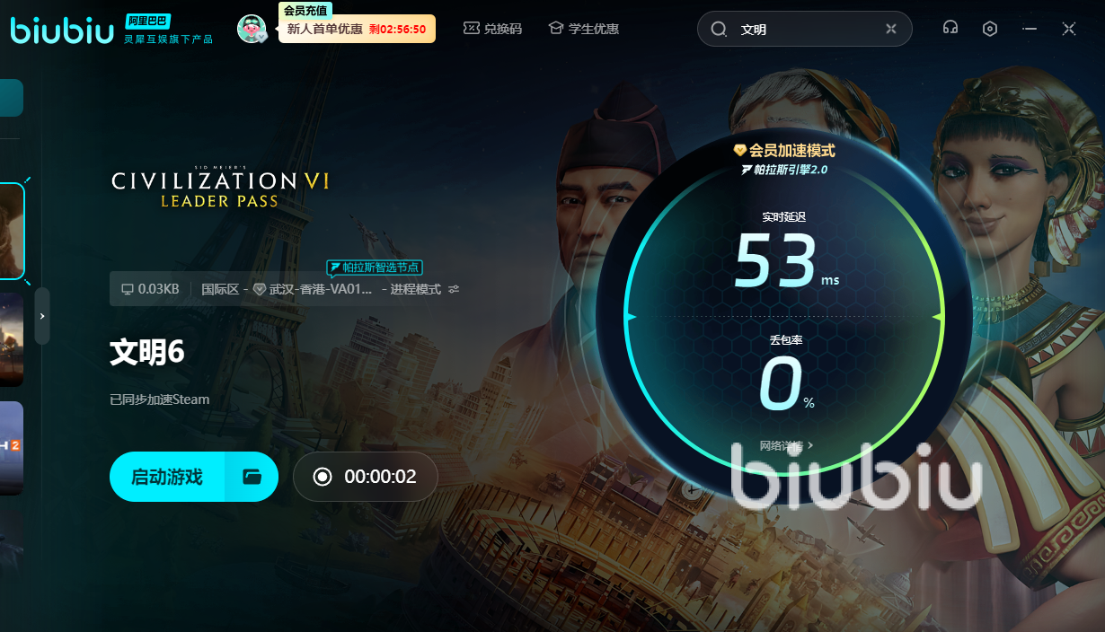 在玩文明六时,尤其是在打PVP模式时,因为战场的瞬息万变,经常会出现刚刚下的命令现在不合适的情况,就需要快点取消以避免一些不必要的损失,而如果网络问题导致游戏闪退,或者操作延误,就很有可能导致满盘皆输的情况,尤其是在大后期,掉线几分钟有可能形势就会发生惊天逆转。biubiu的引擎十分优秀,能够驾驭多种不同的加速模式,从而让游戏对局能更平稳,大家能更无所顾虑地展示自己的雄才大略,而且新用户注册biubiu还能免费体验三小时,新老用户输入兑换码【biubiu不卡顿】还能再领三天加速时间。