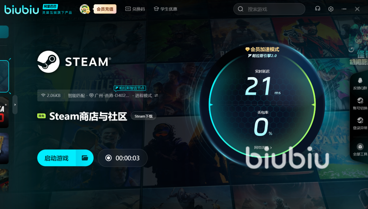 biubiu加速器的使用非常简单,哪怕是第一次接触加速器的小白用户,也能轻松上手。只需要在首页搜索“steam”,一键启动加速后,你就能顺利进入Steam平台,不管是预购游戏,还是下载本体包,都能快速完成,省时省力。