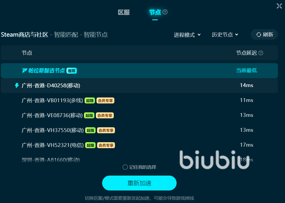 不仅如此,biubiu还提供实时加速状态监控,如果你觉得当前延迟过高,可以随时手动切换加速节点,选择最优节点享受低延迟的畅快体验。因为biubiu拥有海量热门节点,确保来自五湖四海的用户能顺利找到合适的,享受极速的游戏体验。