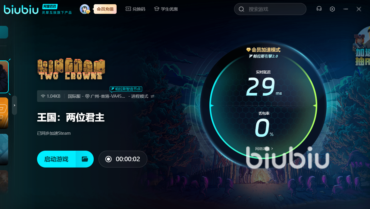 王国两位君主目前来说是一款优秀的海外大作,所以暂时没有上线国服。为了进入王国的世界中成为君主,大家要开启biubiu,才能突破限制来到这里。新用户的话可领取3小时的免费加速,然后新老用户输入【biubiu不卡顿】,就能额外享受三天免费加速。闯关途中太卡的话,那就连基础的关卡都通关不了。所以要用上加速器,才能保证自己有继续前行的能力。