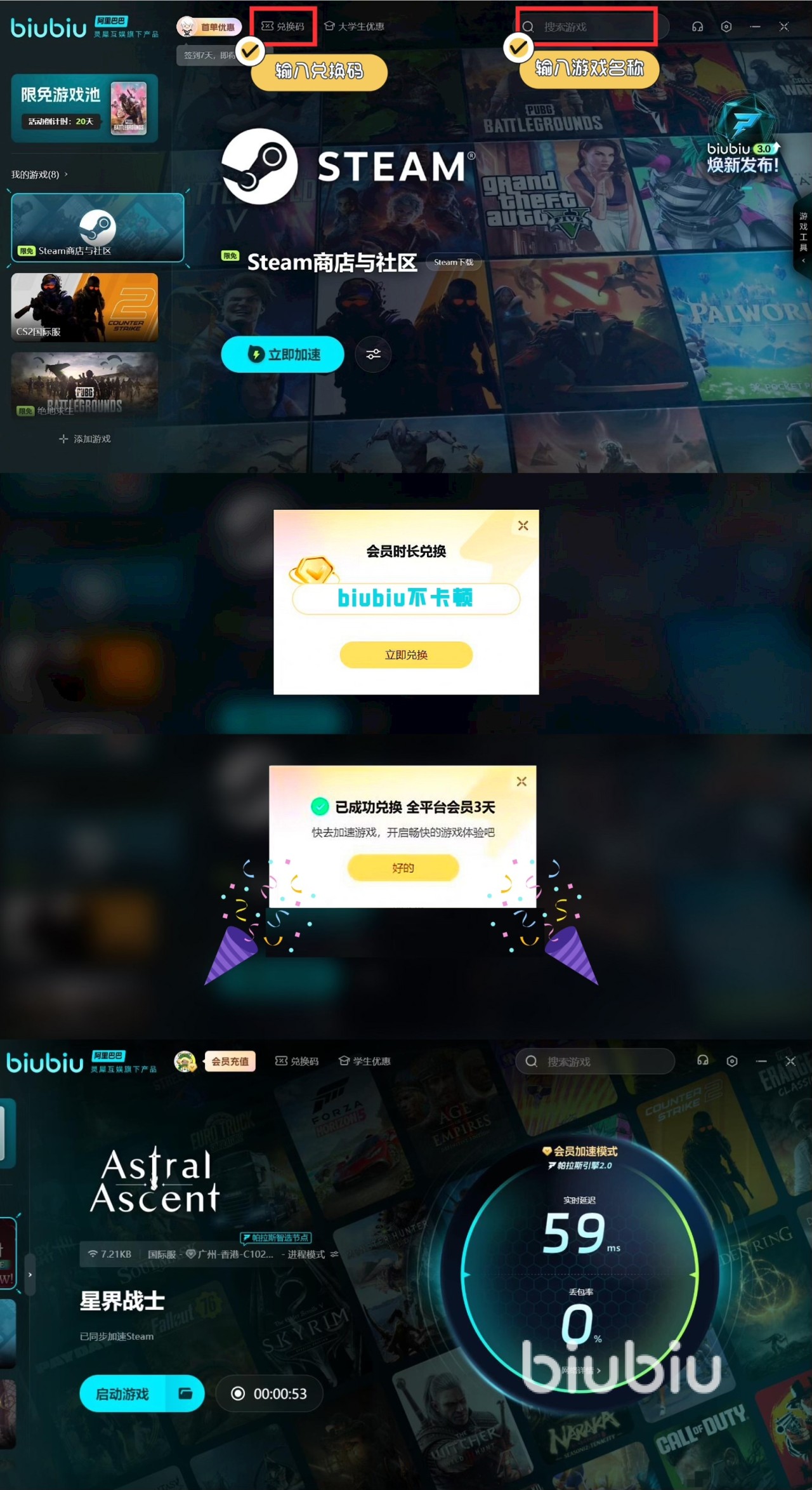 有了这些附魔的辅助,你在战斗中就能释放出更高的伤害,让自己更快地取得胜利。游玩期间,要是你经常碰上卡顿、掉帧的话,可以使用biubiu加速器去解决。近期,平台安排了很多福利,所有用户都能领到兑换码,在软件内输入【biubiu不卡顿】就能领到三天的加速时长,如果你是新注册的用户,那么还能额外领取3小时的加速时长。
