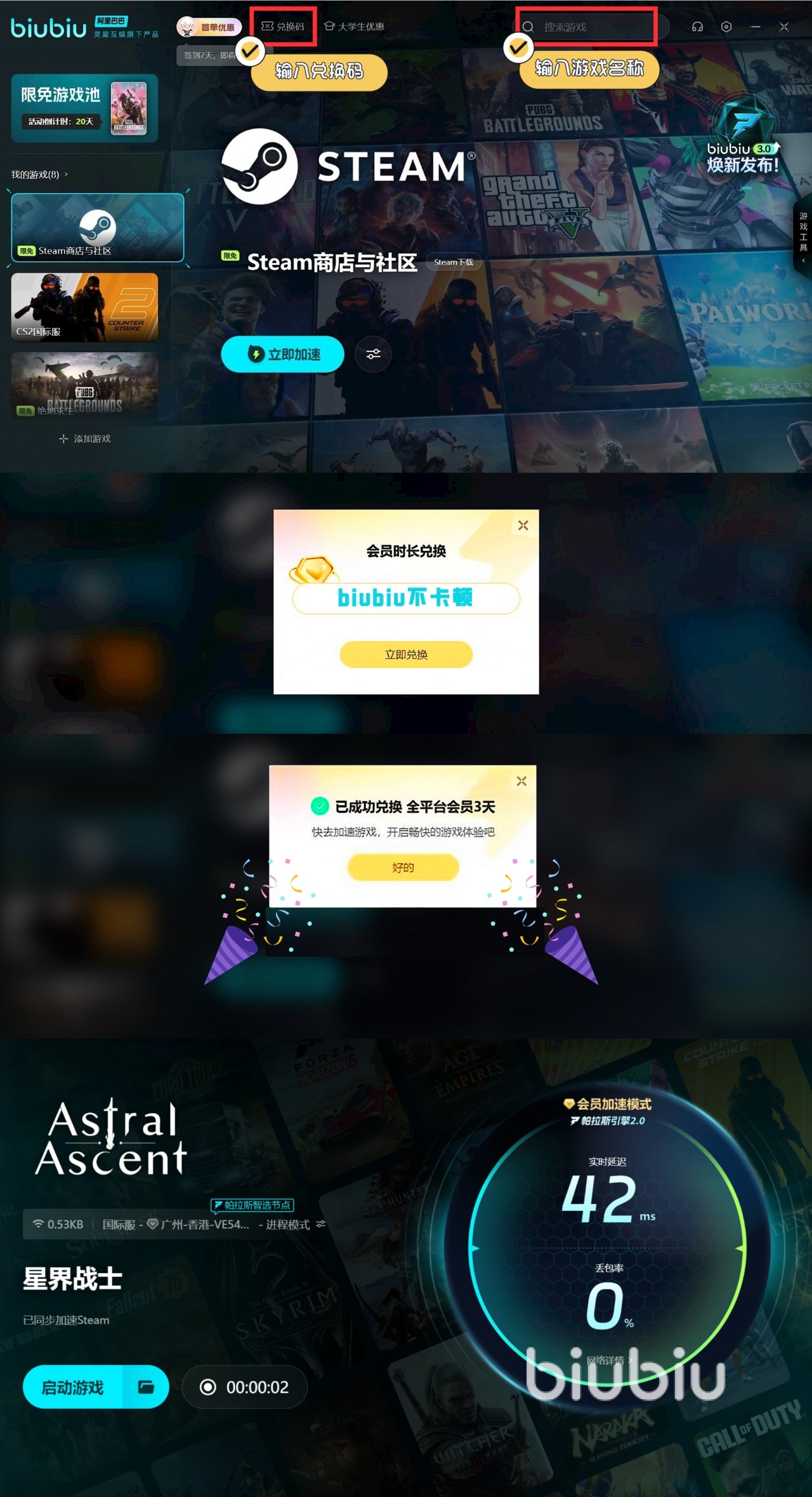 很多玩家在挑战关卡的过程中会选择联机,这样召集一些比较强力的队友可以提高容错率,还能了解不同角色的战斗能力,但是就是很卡,导致关卡挑战的时候直接失败,那就可以使用biubiu来一键优化网络,并且新人在注册后便获3小时免费加速,新老用户均可使用兑换码【biubiu不卡顿】可获3天免费的使用权哦!