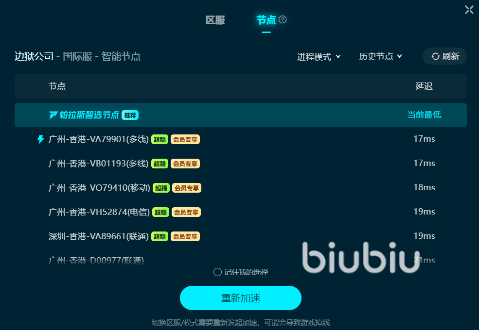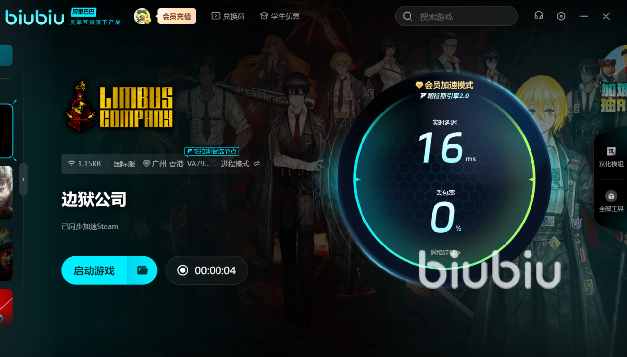 在biubiu加速器的应用内,只需搜索“边狱巴士”或“边狱公司”,就能轻松进入对应的加速页面。biubiu默认会选择国际服,一键启动加速,让玩家无需繁琐操作,轻松享受游戏。