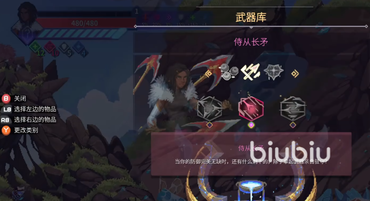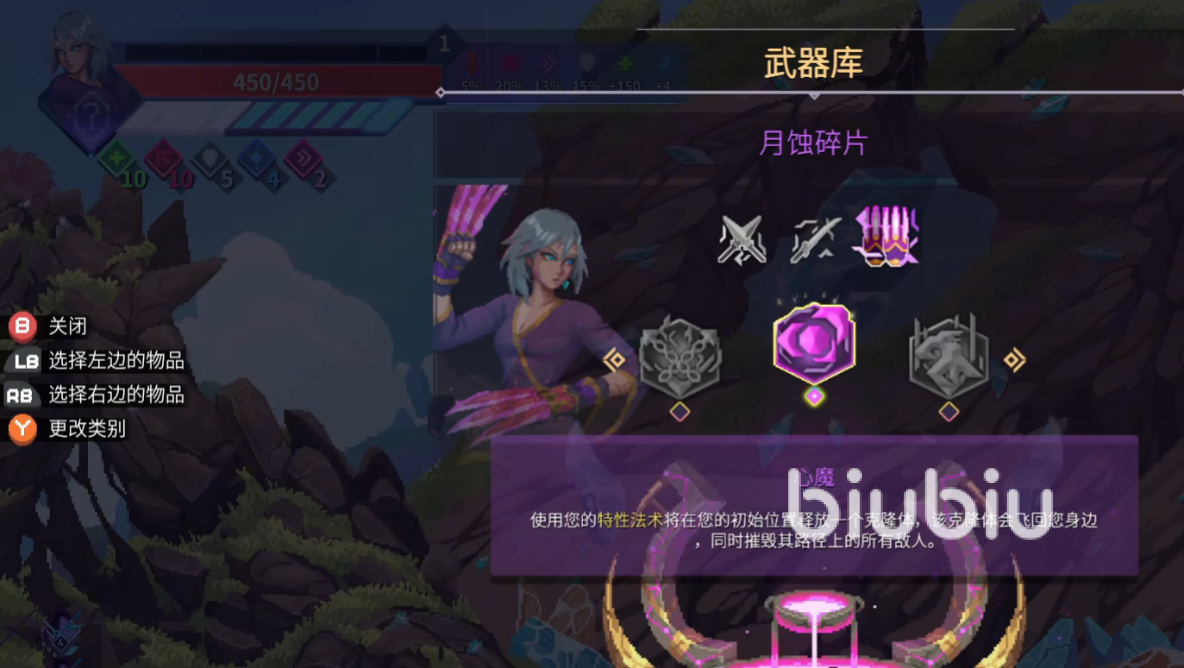 想要更换装备的话,可以先回到出生地中。然后在这个地方找到武器库,交互进入之后,可以查看你当前所拥有的武器。然后武器上也有专属技能,大家可根据个人流派以及闯关需求去选择合适的技能或者武器。如月蚀碎片,又可获得一个法术技能,释放一个自己的克隆体,并来返攻击沿途的对手。