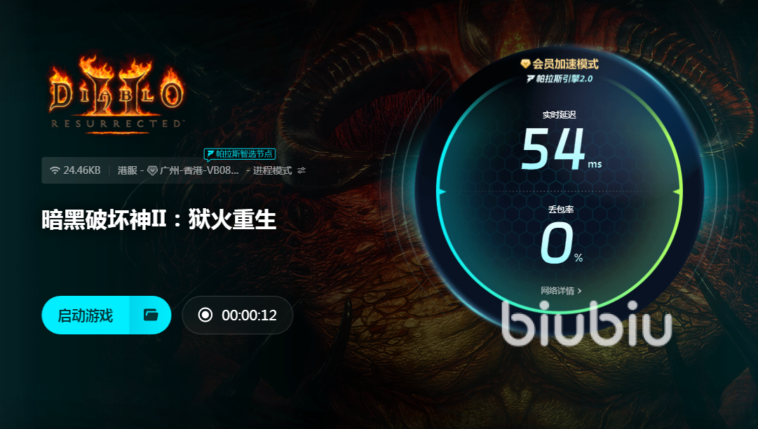 具体使用的流程也非常简单,大家输入游戏的名称就可以搜索到选项,有一点要注意,暗黑2重置版它的正式名称是暗黑破坏神II:狱火重生,大家搜索的时候直接输入这个名字就可以了。找到对应的选项后,直接点击就进入到加速页面中,在此页面可以清楚地看到当前所连接的节点,这个节点是由biubiu根据玩家所在的网络情况以及服务器情况,综合自动选择出来的,可以保证数据在较短线路中进行传输,而且还能智能进行切换。如果当前的节点受到波动影响延迟突然变高,就会自动切换为另一个延迟更低的节点,这样能始终保持低延迟。在此页面中直接打开客户端正常运行就可以了,其他的都不用再操心,即使长时间运行游戏,biubiu也不会出现加速效果衰退甚至掉线等问题,可以放心的在游戏里刷怪。