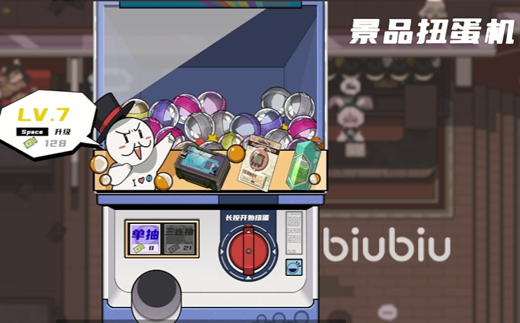 扭蛋机是获取弹珠与加成道具的关键。玩家可通过完成任务获得无量币,用以升级扭蛋机并抽取更高品质的弹珠与加成。加成道具(景品)可在局内为玩家提供额外助力,如增加弹珠在屏幕内的弹射时间、随机发射弹珠增加弹幕等。玩家可挑选三个加成道具带入局内,通过space键保存选择。