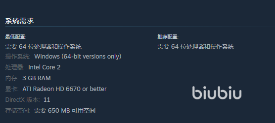 毕竟场景制作以及采用的数据模型都不是很高精度的那种,所以它对玩家的配置要求并不高,能开网页的处理器就可以运行游戏,就是这么简单,显卡就用核显也可以的,当然有好显卡是更棒的,另外存储内存只有650mb,而运行内存只要3gb,超级低的。