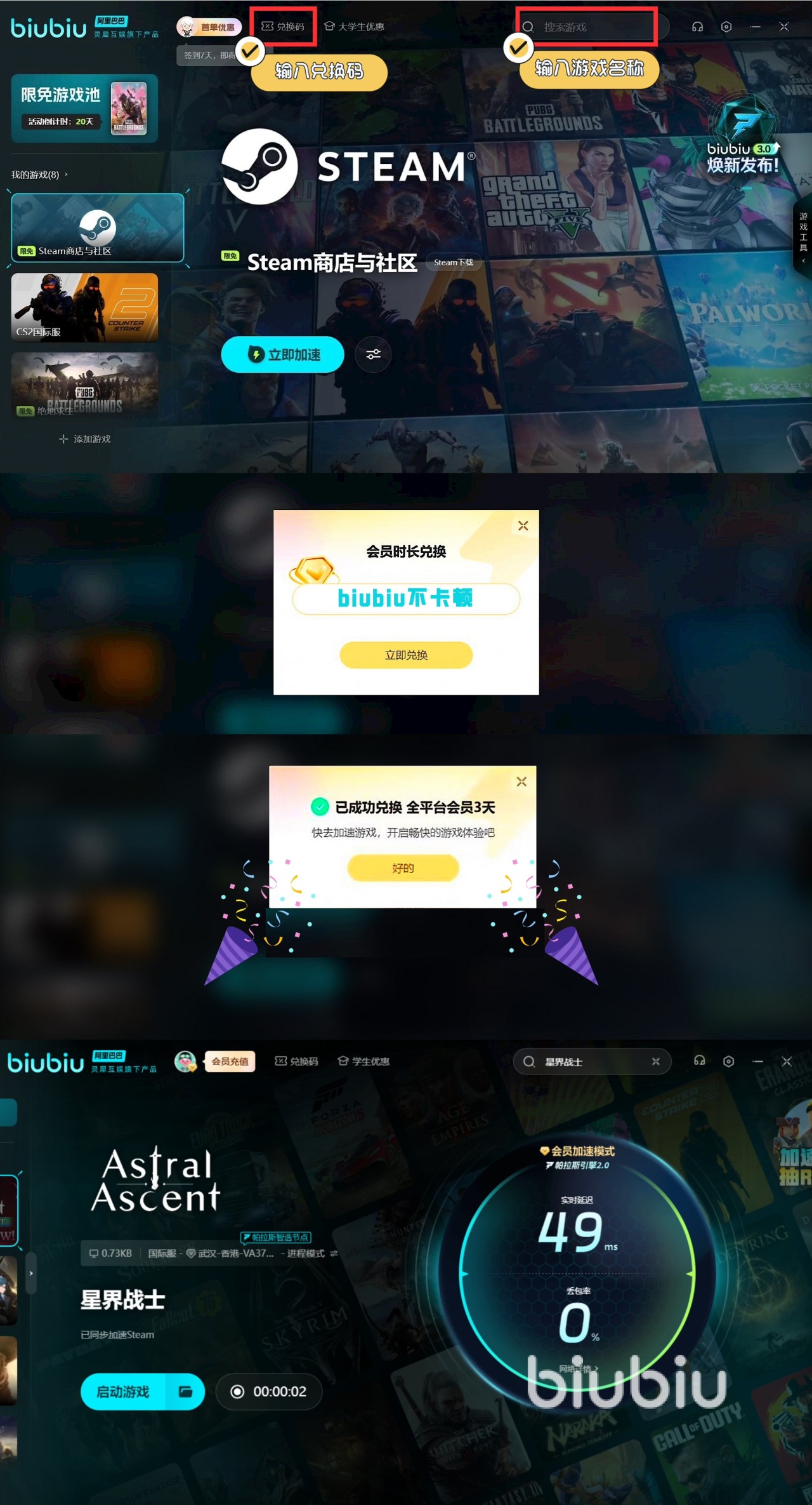 还有一种没有办法顺利登陆的原因就是大家的网络有问题,如果网络不好,就很容易出现不能登陆游戏或者不能登录steam的情况,会一直提示错误,而使用biubiu加速器对steam和星界战士进行加速以后,这种情况就会好转很多,biubiu的专家级加速线路有着很优秀的性能,同时biubiu的新用户注册以后还能先免费体验三个小时的加速,同时无论是新用户还是老用户只要在兑换栏输入【biubiu不卡顿】就能再领三天的免费加速时间,福利满满!