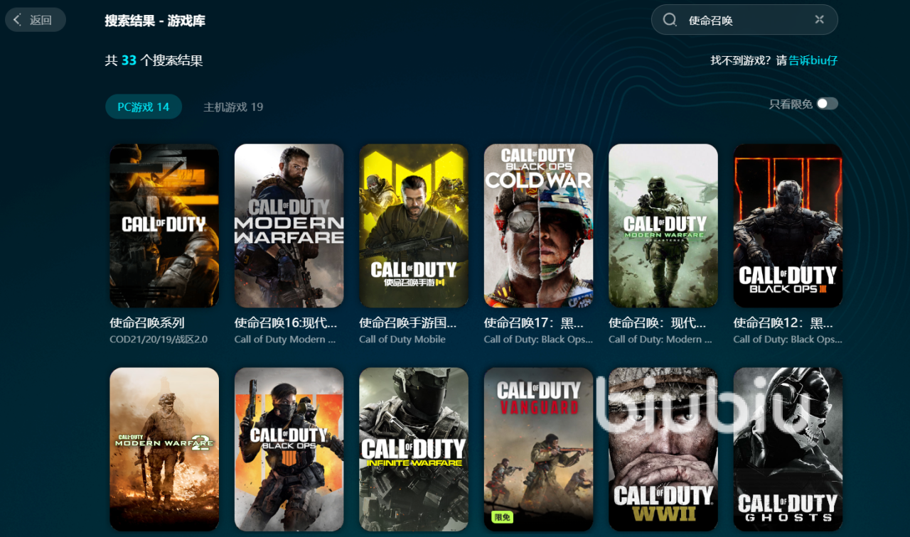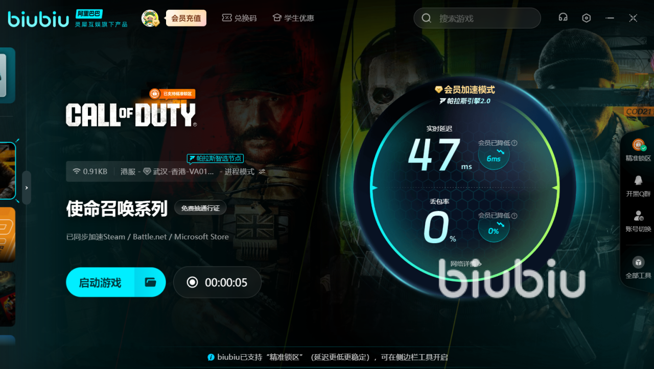 值得一提的是,biubiu游戏库收录《使命召唤》系列的绝大部分作品,包括了热门的cod20、cod21等。只需一个会员账号,你就可以畅享这些经典作品的加速体验。只需点击“使命召唤系列”的图标,biubiu会自动为你打开精准的锁区识别系统,确保加速效果更加贴近你的真实网络环境。无论你是在玩最新作,还是回味经典的老版本,它都适用,让你在战场上游刃有余。