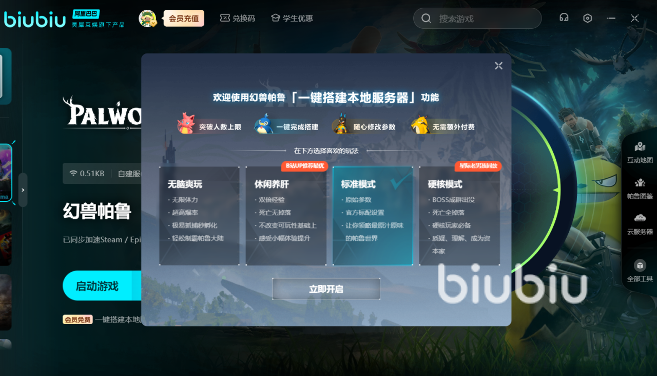 biubiu加速器不仅仅是解决延迟问题那么简单,它的功能远不止此。对于biubiu会员用户,提供了一个非常贴心的自建服务器功能。只需按照页面上的简单教程,你就可以轻松搭建自己的游戏房间,并且选择四种模式中的任意一种:无脑爽玩、休闲养肝、标准模式、硬核模式。无论你是想轻松玩耍,还是挑战极限,这里都有适合你的选择,且自建房间更加便捷流畅,随心改参数无需额外付费,biubiu将始终伴你左右,确保你的联机体验不受远距离服务器波动干扰。
