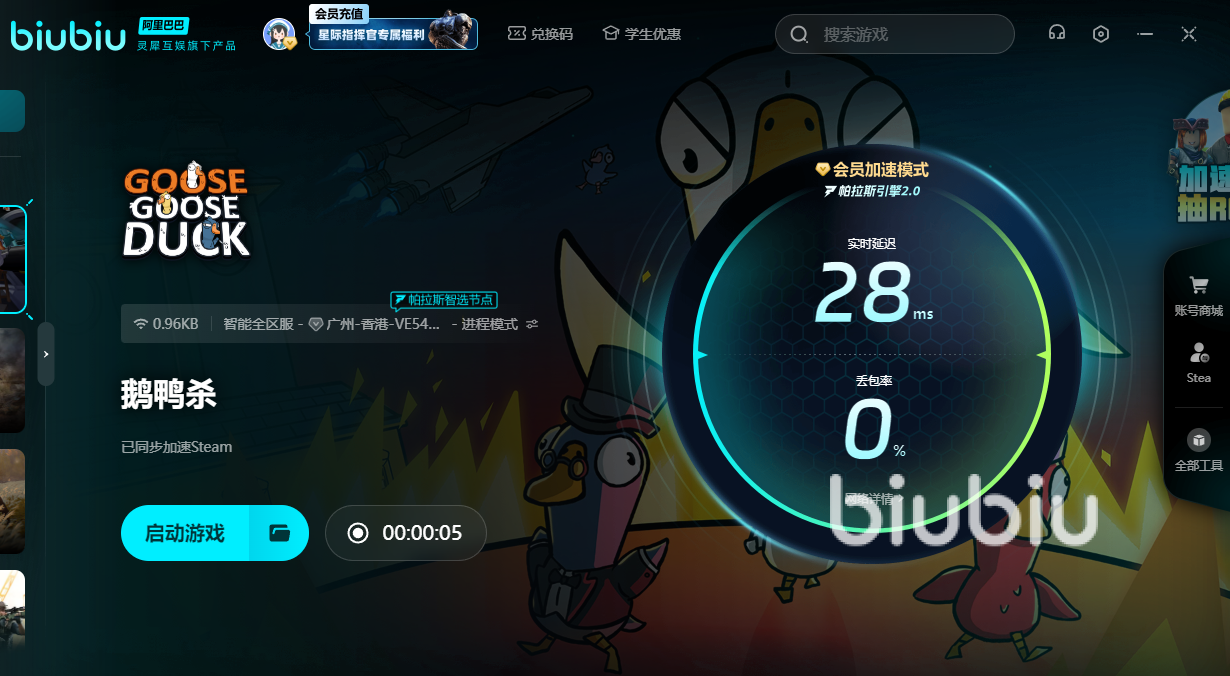 鹅鸭杀目前仍旧是一款很受欢迎的海外佳作,而且暂时没有上线国服。这时大家可以用biubiu,加速过后才能进入太空宇宙中一起玩一场有趣的比赛。新用户的话可获得3小时的免费加速,然后新老用户输入【biubiu不卡顿】,额外畅享三天免费加速。如果成为鹅之后太卡的话,那就会被鸭子快速解决,自己也不能完成其他任务。采用加速器以后,才能迅速扮演好自己的身份,避免让其他鸭子有机可乘。