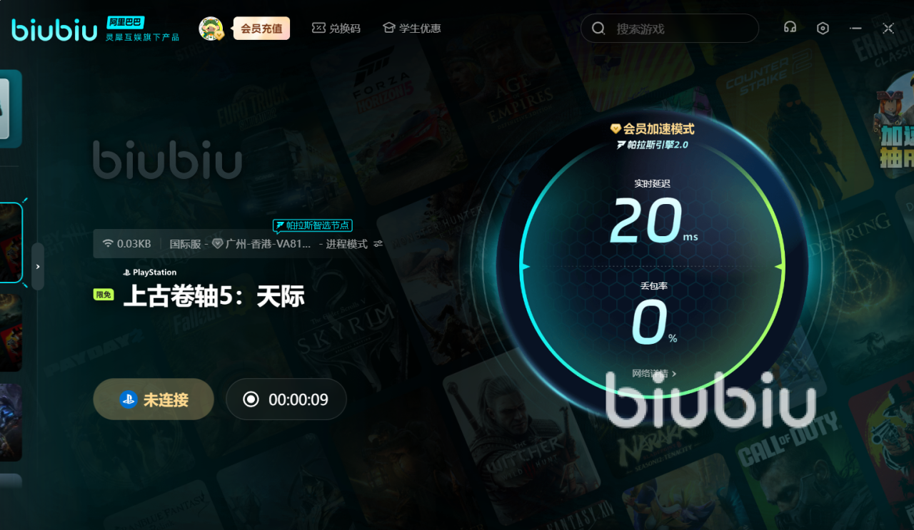 可一目了然地看到,加速界面上的实时延迟值在仅20ms左右,在线的读档、存档就能很快速地完成。如果你已经爱上了这种畅快无阻的游戏体验,biubiu还为你提供了多种灵活的充值套餐,随心所欲选择!
