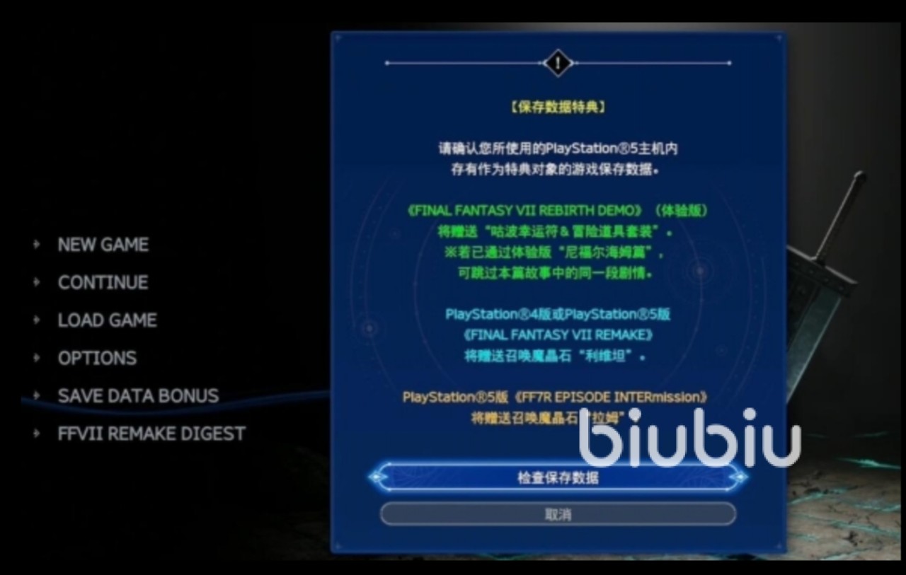 可导入的存档来源丰富。若在自己账户上玩过《FF7重生》试玩版,就能导入其【PS5存档】;安装了PS4或PS5版本的《FF7重制版》(第一部),便可导入《FF7重制版》的【PS4存档】;要是备份过《FF7重制版DLC间奏》的【PS5存档】,还能从PS Plus上下载并导入。