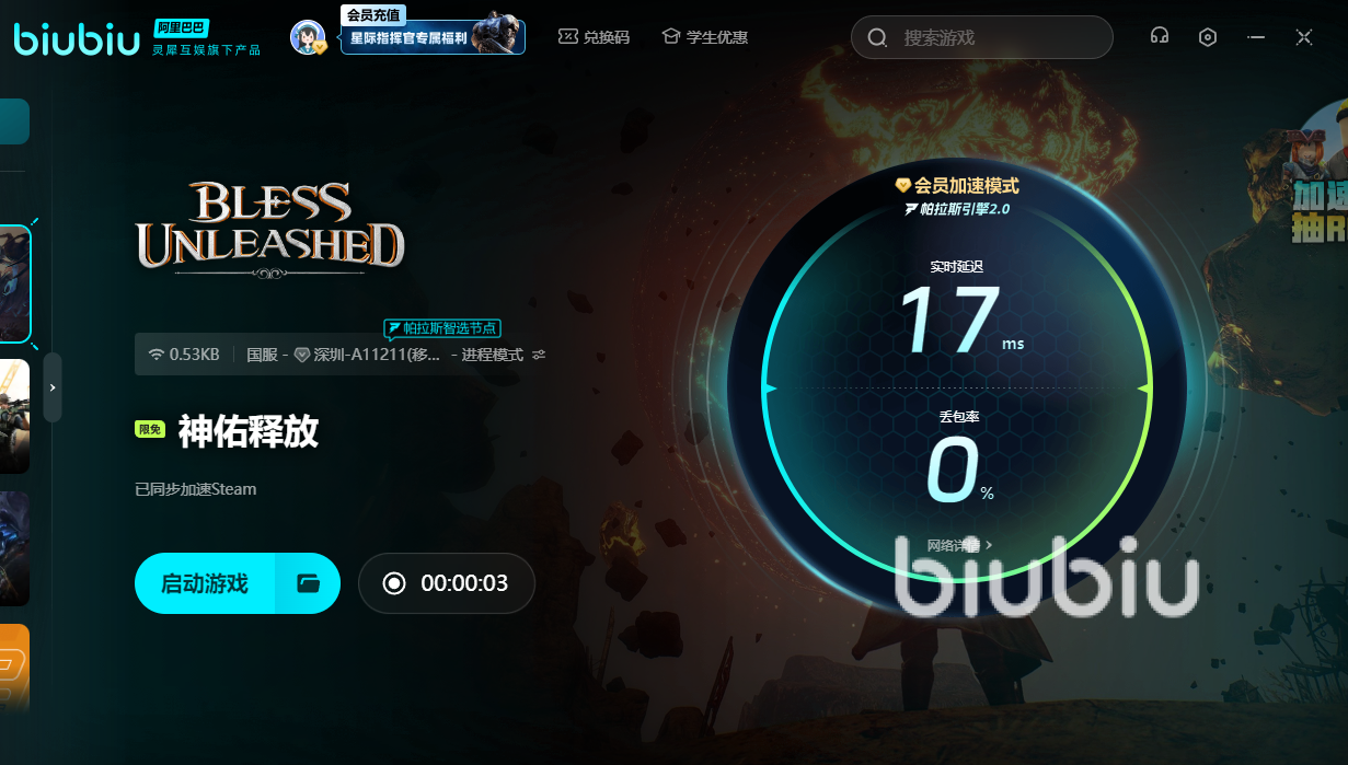 当大家玩神佑释放时太卡的话,那可能就很难行动了,更别谈走出新手村去消灭基础怪物。这时可以用好biubiu,稳定加速后自然能顺利解决小怪,并一路发育好。新用户的话可获得3小时的免费加速,然后新老用户输入【biubiu不卡顿】,便可额外领取三天免费加速。如果在真正的世界大战时延迟高,那可能就会成为战场中的炮灰,更别谈为组织或者阵营做出贡献了。要用上加速器后,就能更快冲上场上与敌人交战,并积极屠戮其他对手。